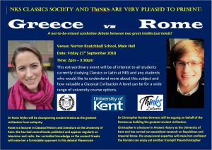 You are all welcome to bring your students to this event in Ashford, Kent on Friday 21st September 2018. Listen to the University of Kent’s Dr Rosie Wyles in combative debate with Dr Christopher Burden-Strevens over which was the greatest ancient civilisation. Free event. Contact pfound@nks.kent.sch.uk to reserve places.