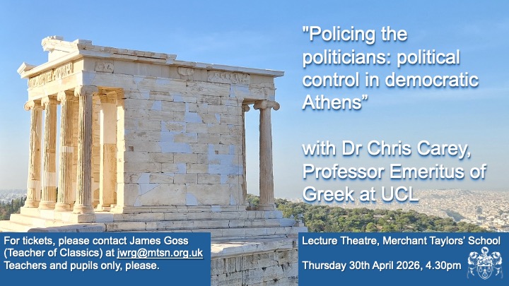 Dr Chris Carey, Professor Emeritus of Greek at UCL, will be giving a lecture at the school entitled “Policing the politicians: political control in democratic Athens”. Here is a summary of the talk from Dr Carey: