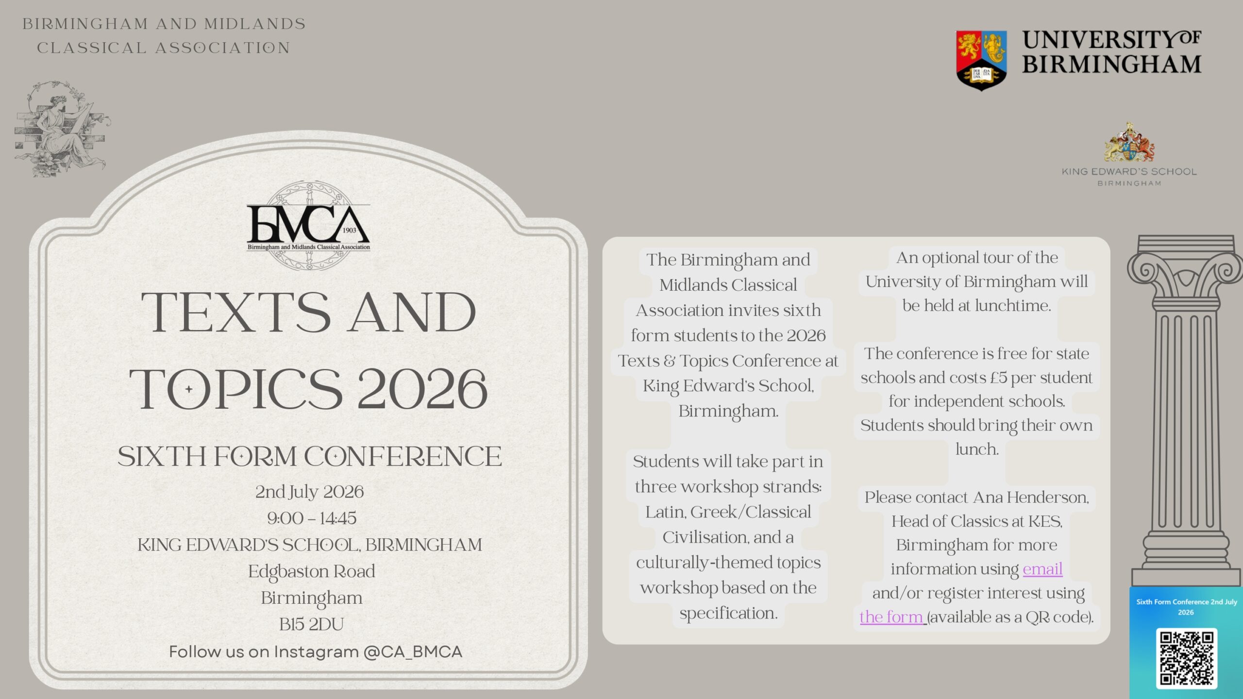 The Birmingham and Midlands Classical Association invites sixth form students to the 2026 Texts & Topics Conference at King Edward’s School, Birmingham. Students will take part in three workshop strands: … Continue reading "BMCA A Level Classics Conference 2026"