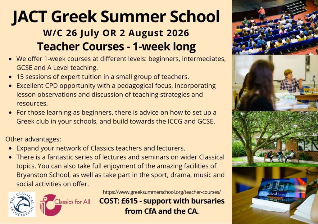 Over recent years, we have expanded our teacher course offering at the Greek Summer School. This year we will run 4 1-week residential courses (running in either week of the Summer School) tailored to different levels, from absolute beginners to those preparing to teach GCSE and A-level texts. Please apply through our website (https://www.greeksummerschool.org/), where you can find more info, or see the flyer below.